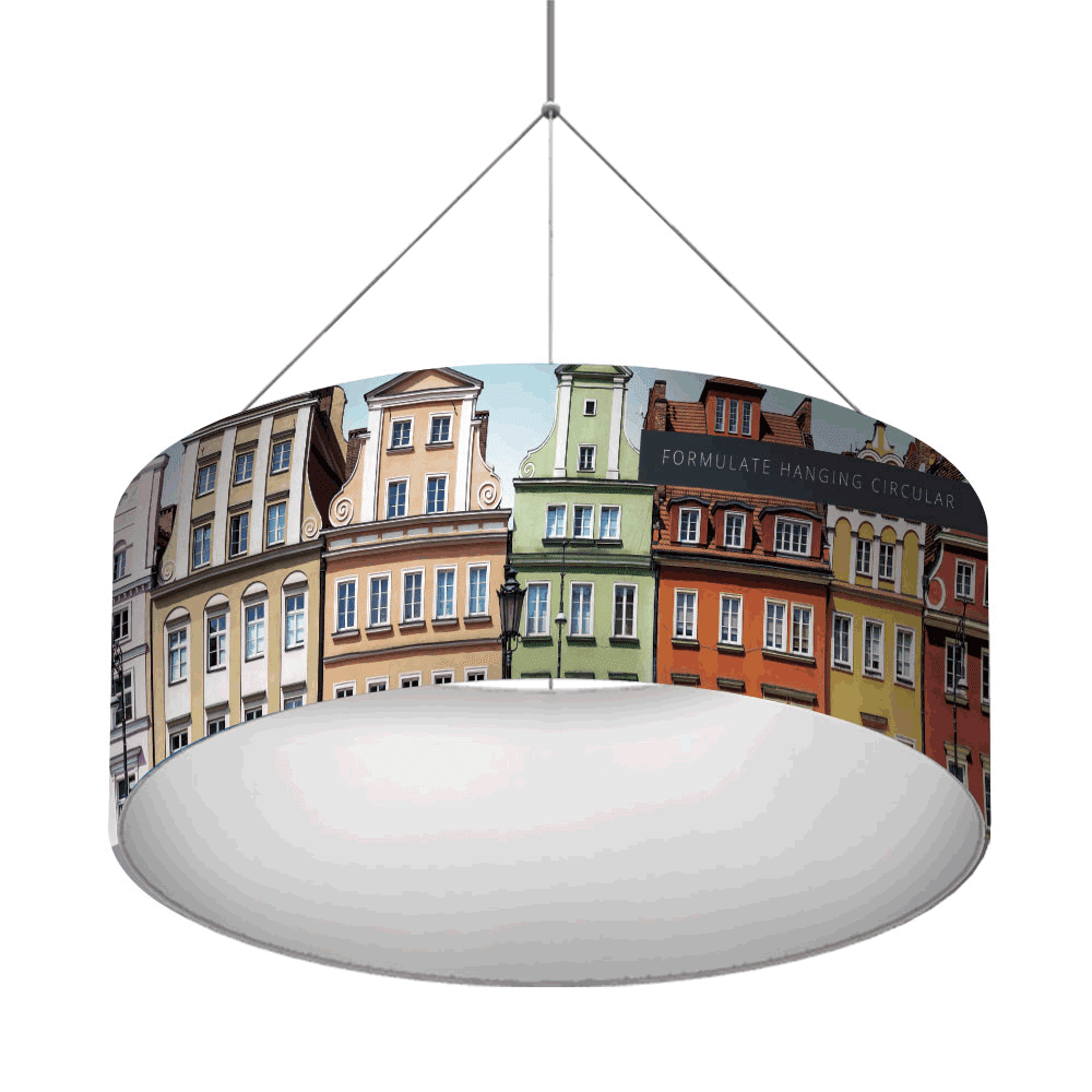 Formulate Circular Hanging Structure make a dominant topper for your exhibition stand, sign-posting your location across any exhibition hall. Suspended from the roof this high level branding opportunity will help visitors will find your stand more easily. We offer three different diameter/height sizes ranging from 1.5m to 4.6m diameter. Cables not included. Click here if you are looking for Formulate Straight
